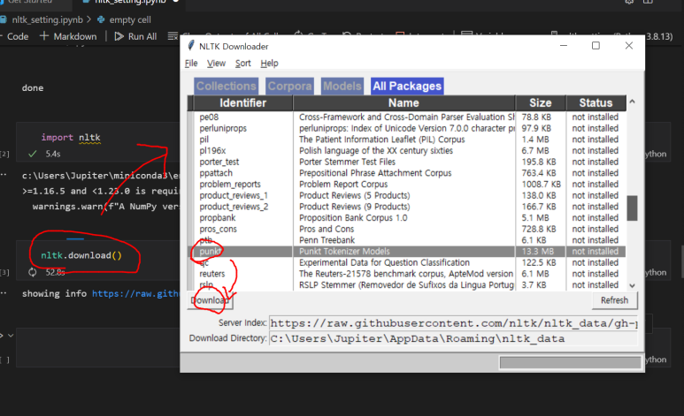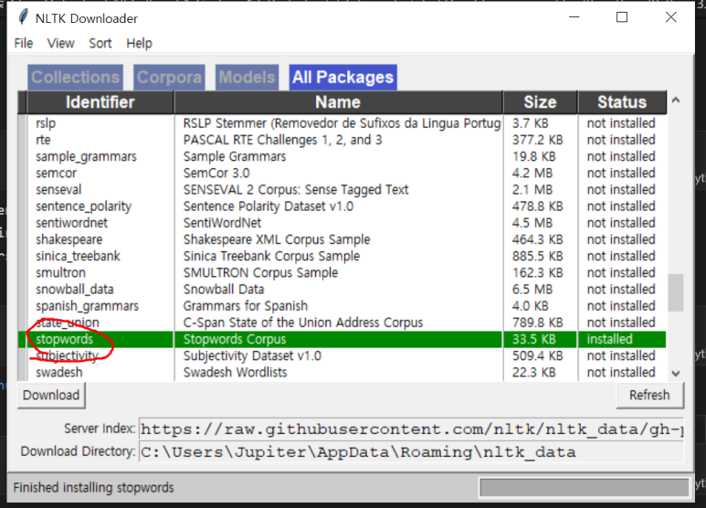 nltk.download() 코드 치면, 다운로드 할 수 있는 창이 하나 뜨는데 All Packages 에서 punkt와 stopwords를 설치해줍니다.