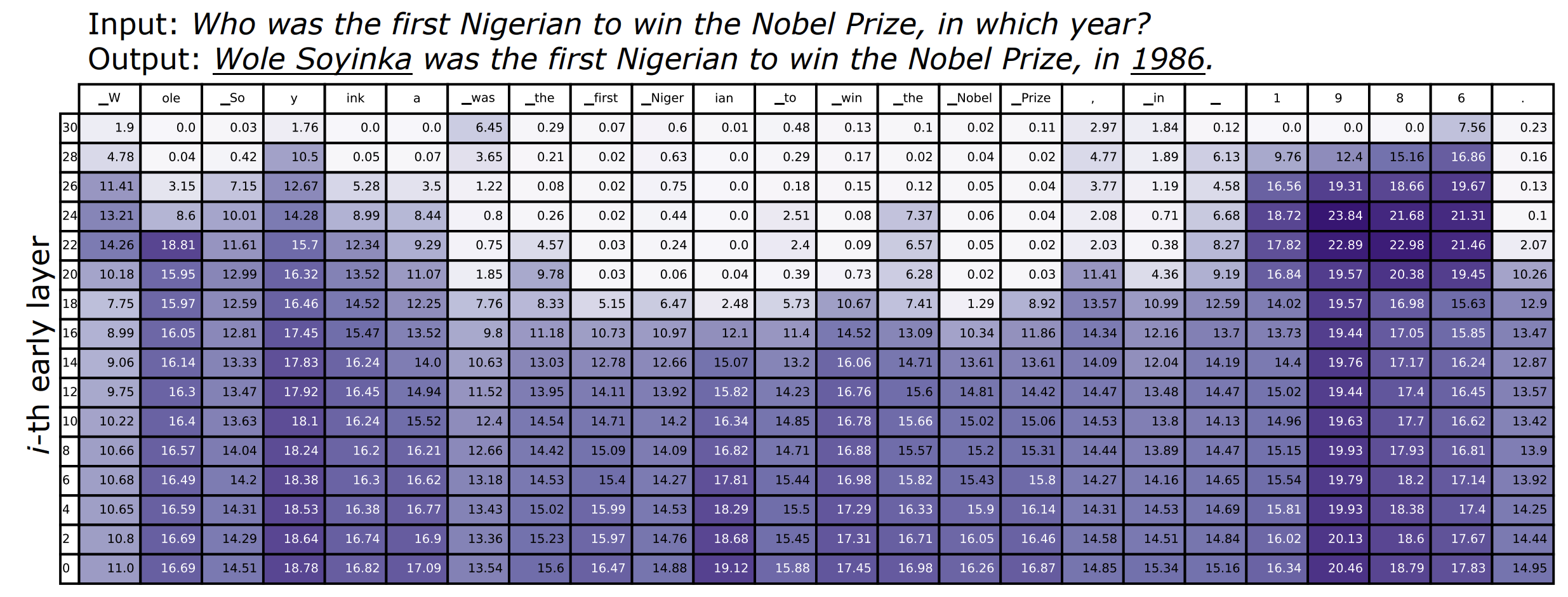 - Factual Knowledge 가 필요한 Named Entity 또는 Date를 예측할 때, JSD는 후반 Layer에서 매우 높음 ( "Wole Soyinka", "1986" ) => LM은 후반 레이어에서도 Prediction을 바꾸고, Prediction에 Factual Knowledge를 주입하는 구나.