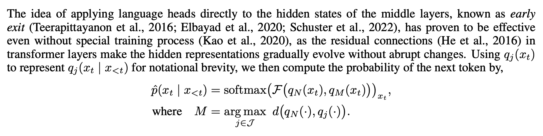 - N 개의 Layer가 있다면, 각각의 Layer에서 앞서 설명한 Next Token Prediction을 뽑아내는 것을 Early Exit이라 합니다. (Teerapittayanon et al., 2016; Elbayad et al., 2020; Schuster et al., 2022)