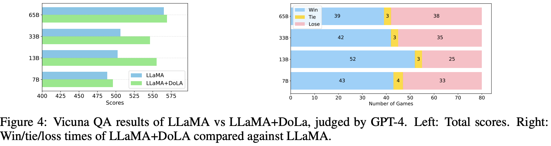 - Chatbot 에서도 DoLa가 효과적임을 보았고, 특히 13B, 33B에서 Baseline보다 크게 높은 성능을 보였다.