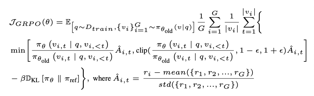 GRPO는 PPO(Proximal Policy Optimization) 변형이고, 위 보상값 r을 활용합니다.